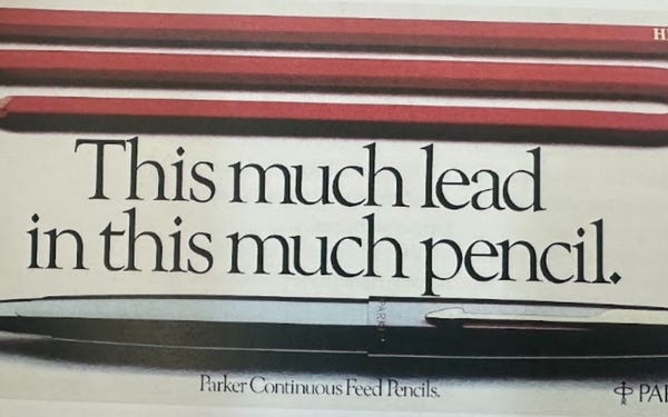 Why I like it:Good ads help people easily make associations with things they already know, and this ad for a mechanical pencil does that well. But notice the copy and the graphics are dependent on one another to get the message across.