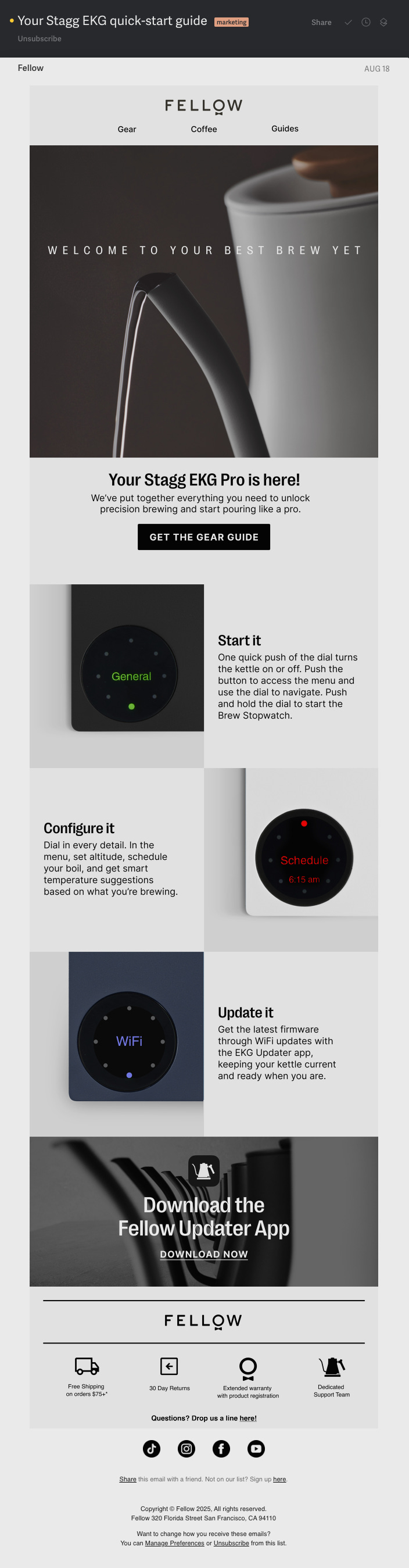 Why I like it 👉 I recently ordered a new hot water kettle for my manual brew bar, and received this email as a follow up the next day. Thought it was great post-purchase (pre-delivery) flow email that educated me about the product so I could start using it right away.